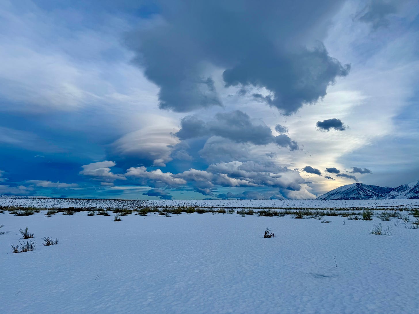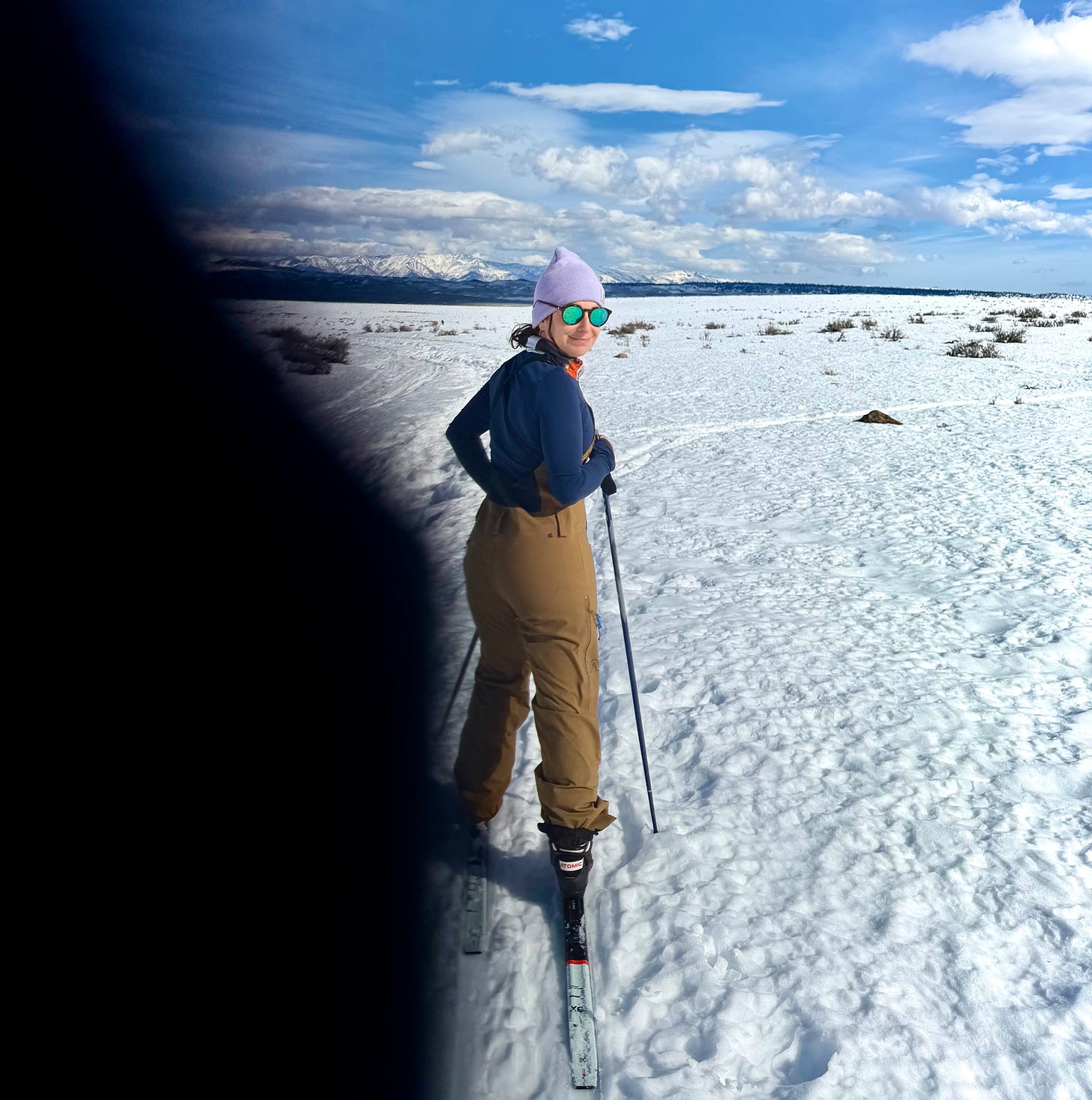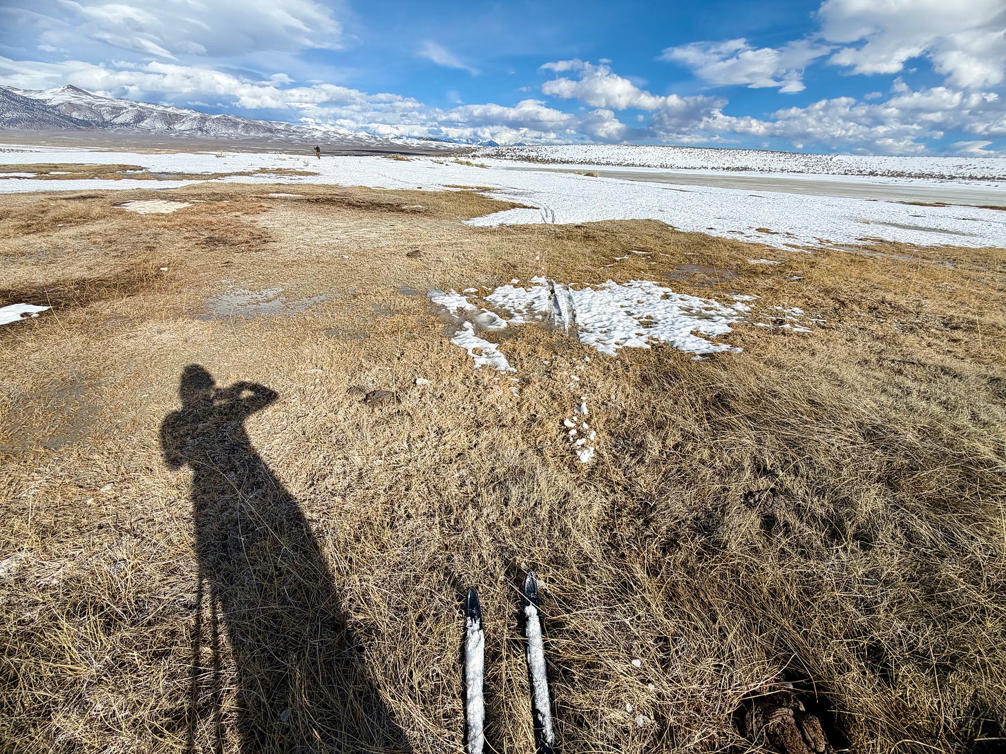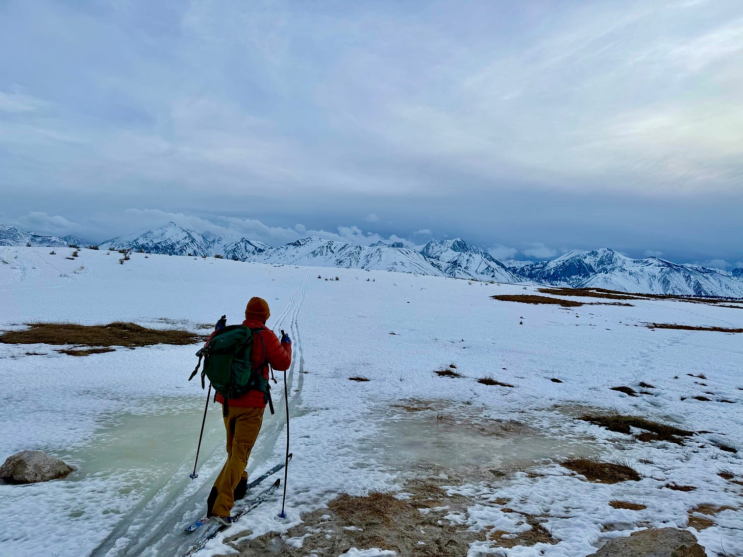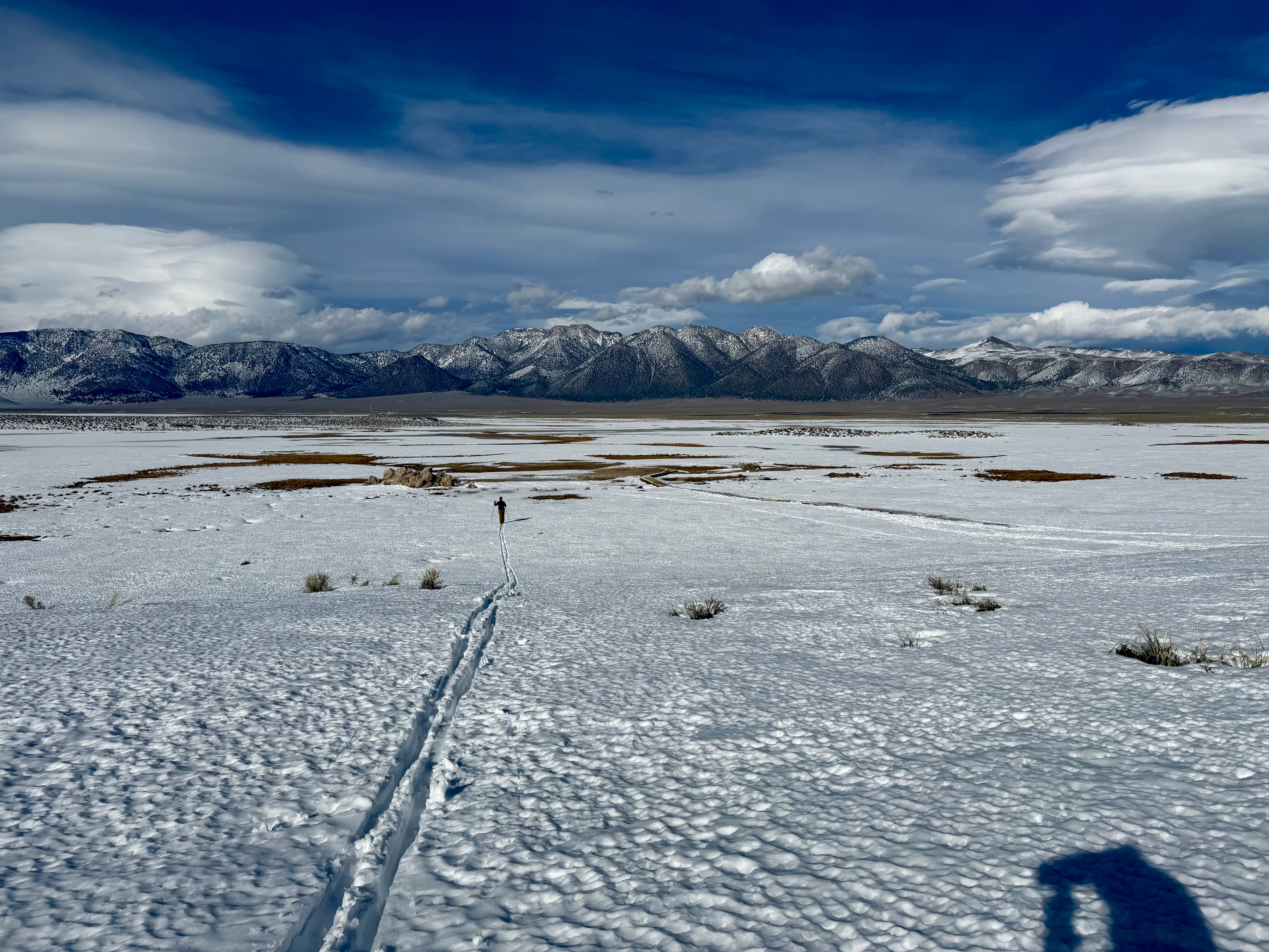 Skiing out to the open field, the Sierra peaks behind me with a contrast of their snowy white peaks and a bluebird day that felt taken out of a mountain magazine. The intense sun creates a deep blue against the fresh white snow coating the incredible mountain range behind. Patches of the brush and desert ground are beginning to peek through, as it is clear this window of opportunity is dwindling. We are surrounded by ranges: the Eastern Sierra and the White Range (a place I haven’t explored yet, but would love to).
