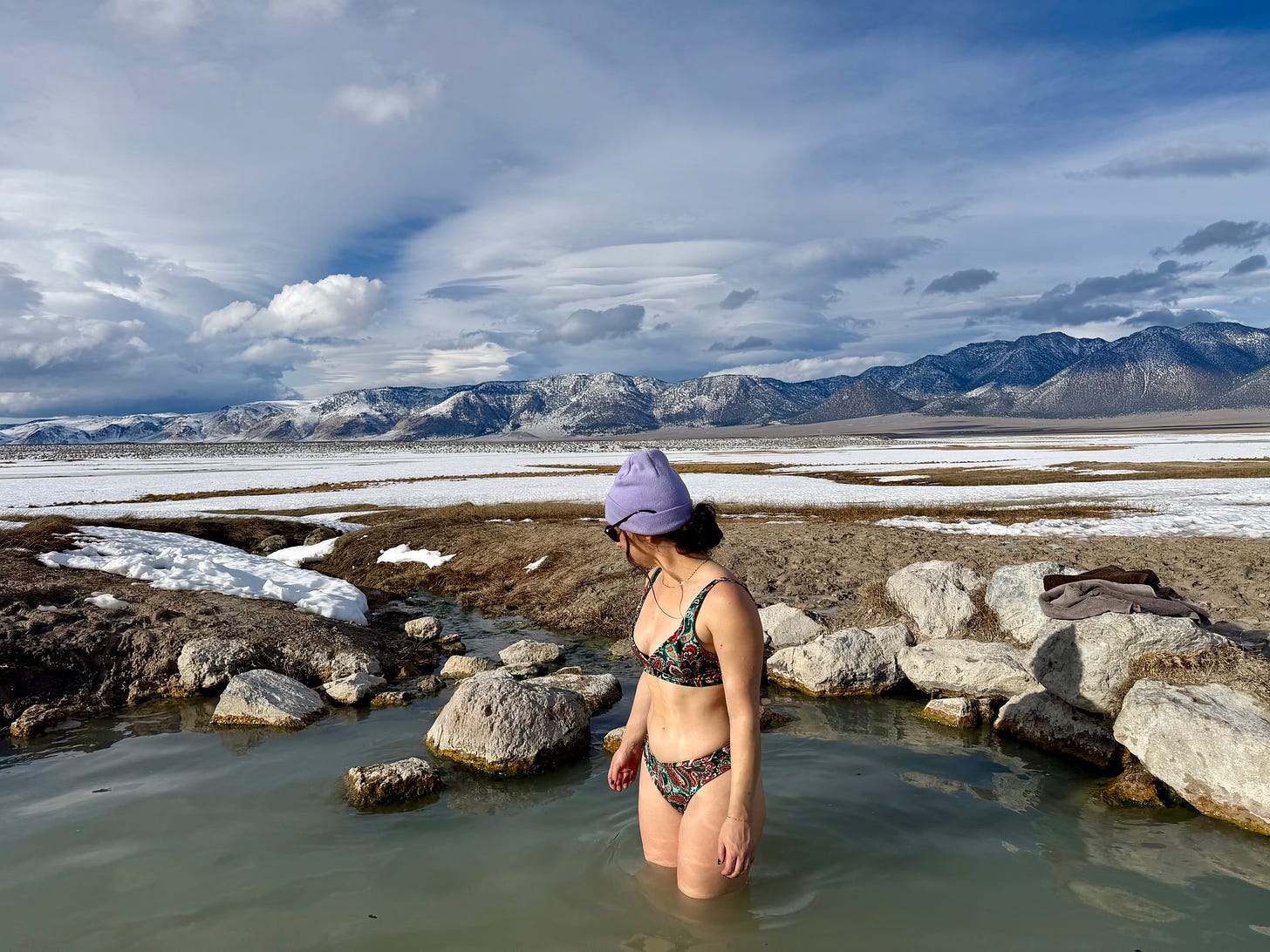 Skiing further we finally make our destination. I scurry to the side of the rocks, and with not a person in sight, I peel off my ski clothes, laying everything on the rock. I am barefoot, standing on rock and snow, where I let out a small yelp as I begin climbing into the spring. I ease into the water as suddenly the warmth of perfect temperature water begins to sting my cold skin. I take it in for a few minutes, and when the stinging stops, I take in the views around me.