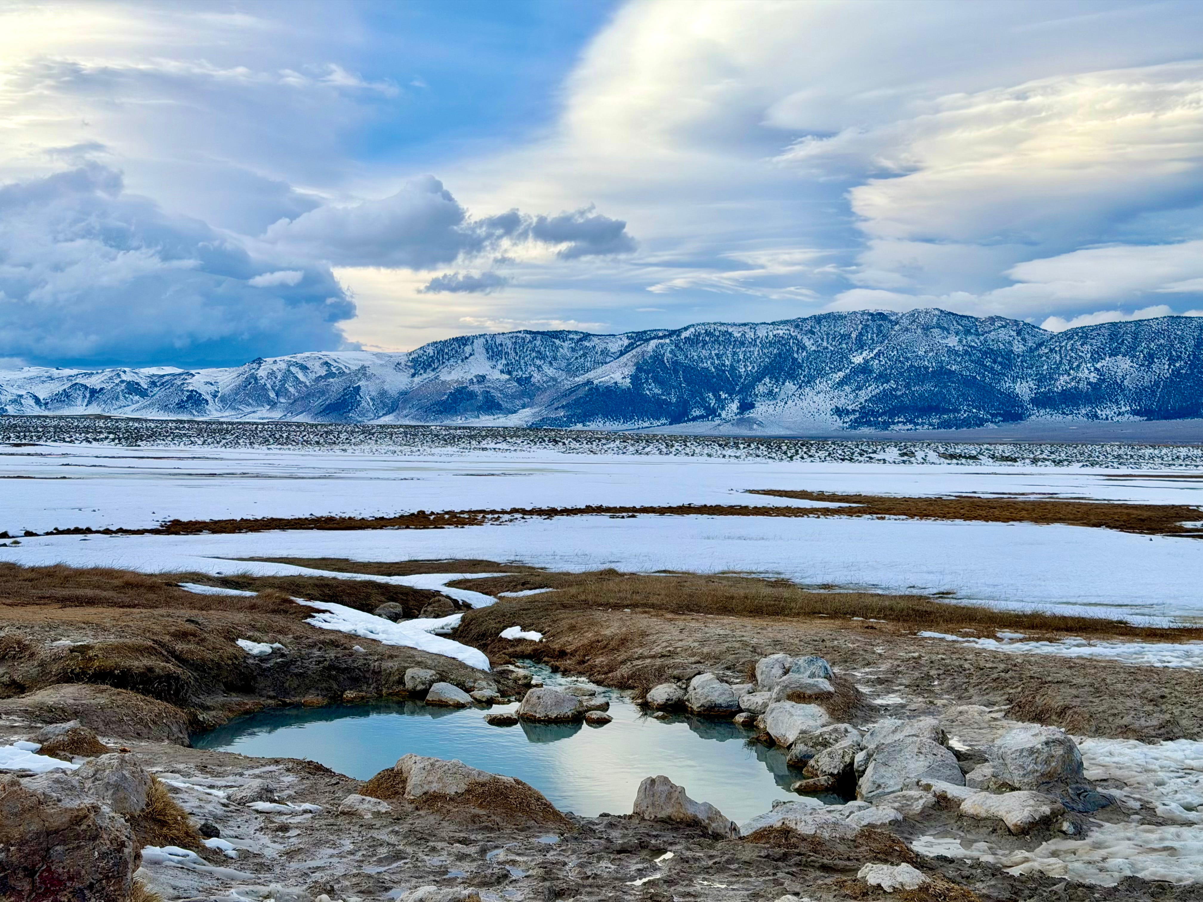 There was a crisp silence from the cold air, and you could feel the mountains around you come alive, covered in a fresh coat of snow as the deep blue of the sky mixed with stormy clouds taking over. We spent hours there, and eventually, two guys joined us who had decided to hike in through the thick snow. We shared conversations; I always tend to meet interesting people at the springs, from jet propulsion engineers to trail angels, etc. This time a man told me a story of chasing a girl he fell in love with here in Mammoth.