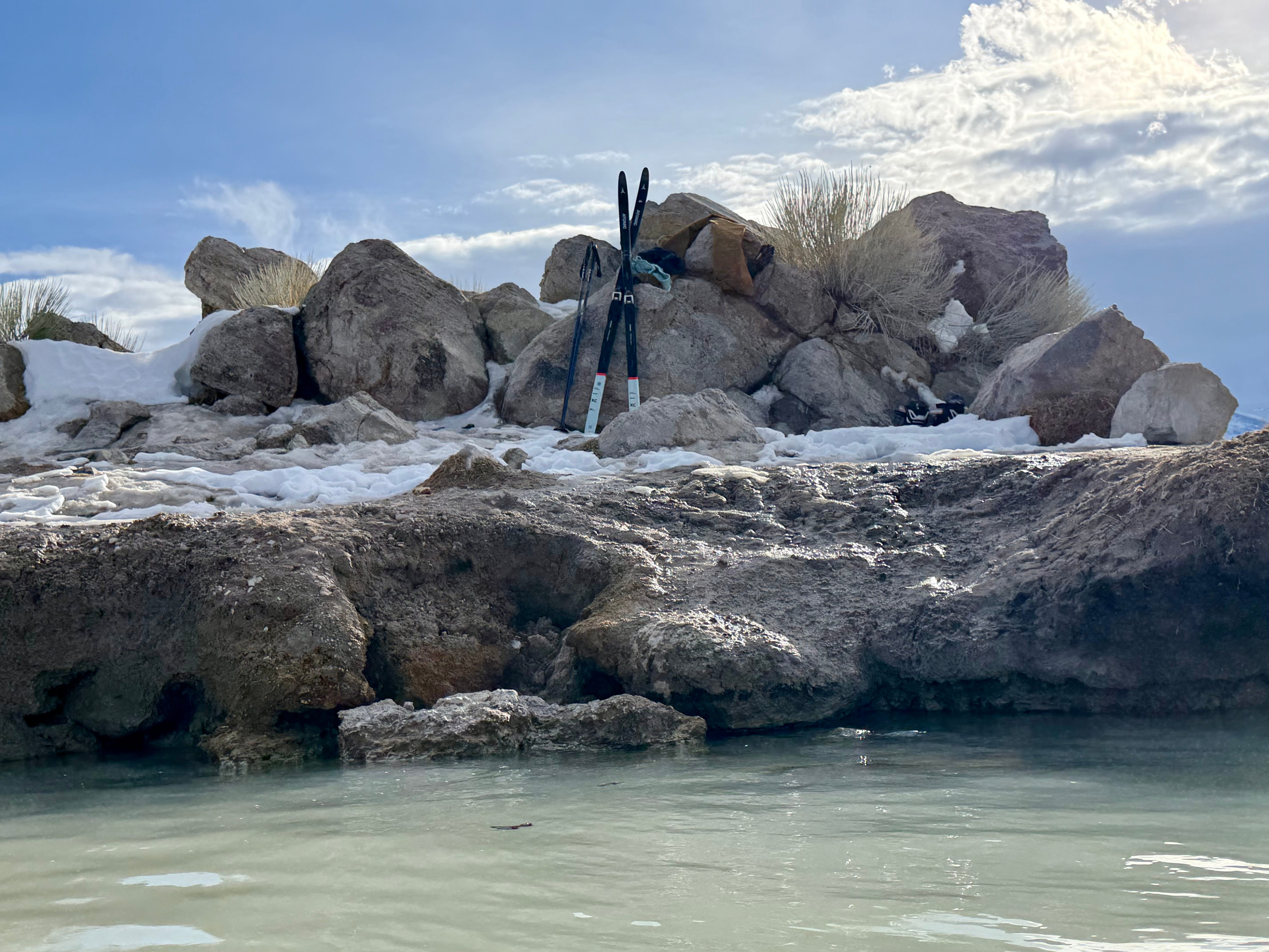 Staring into the cluster mess of the trunk of my car, I begin pulling out my cross country skis. Clank* As the multiple skis clap together, I begin to question all of my life decisions and how many pairs of skis I have in the car. I reach for the cross country skis with the thought that buckling my touring boots in a swimsuit in the snow with 50mph winds didn’t feel super fun. We jump into a foot bank of snow and begin loading up.